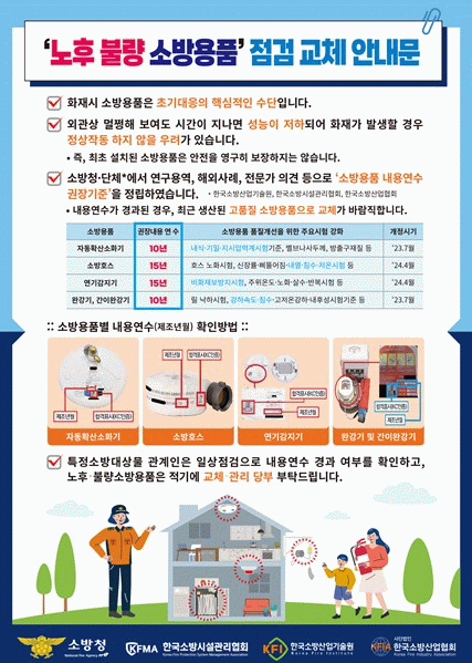 관계인은 평소 자체점검 과정에서 제품의 제조연월과 형식승인 표시 등을 확인해 내용연수 경과 여부를 살피고, 외관 손상이나 변형, 누수, 감지 이상 등 기능 저하 징후도 꼼꼼히 점검해야 한다. 특히 권장 내용연수가 지난 제품이나 노후화가 우려되는 소방용품은 최근 강화된 품질기준을 통과한 제품으로 교체하는 것이 바람직하다.