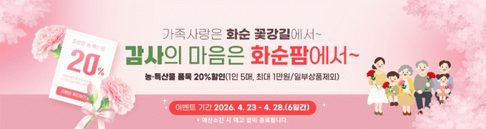 ‘감사의 마음 전달 쪽지’ 코너는 이벤트 게시판에 가족이나 스승, 소중한 이에게 전하는 감사 메시지를 작성하면, 우수 작성자 10명을 선정해 화순팜 입점 농특산물 등 2~3만 원 상당의 상품을 증정한다.