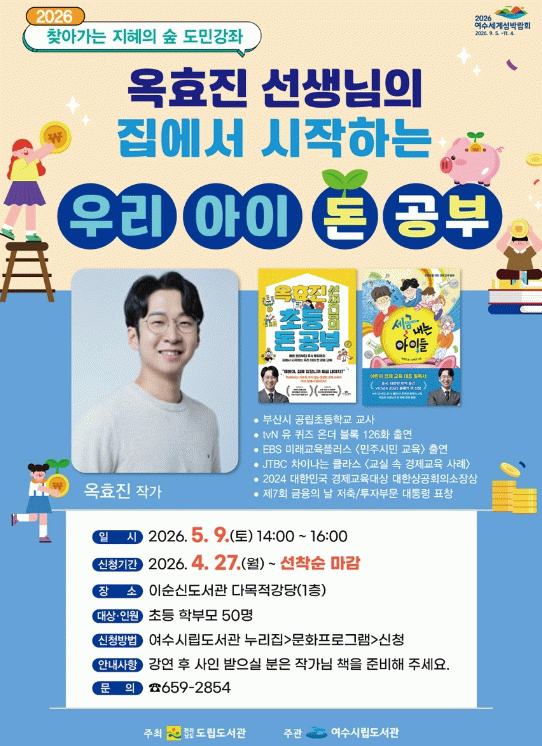 이번 강좌는 『세금내는 아이들』, 『옥효진 선생님의 초등 돈 공부』의 저자 옥효진 작가를 초청해 초등학생 학부모를 대상으로 ‘집에서 시작하는 우리 아이 돈 공부’라는 주제로 진행된다.