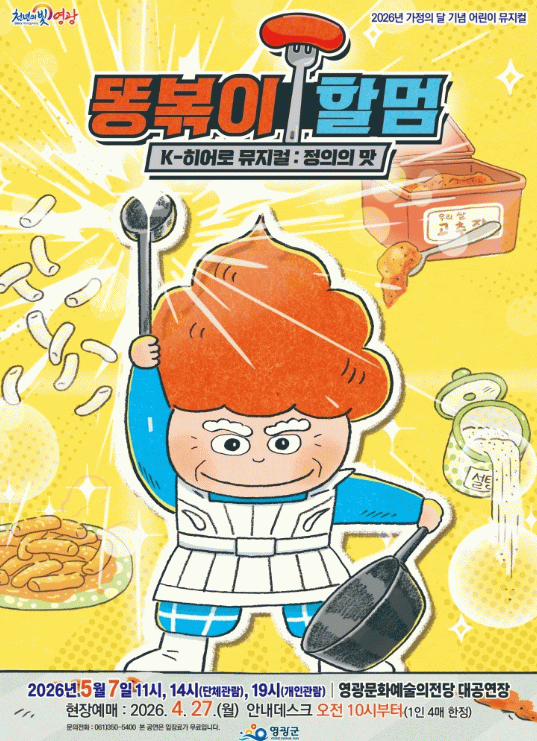 관람료는 오후 7시 전석 무료(선착순/1인 4매 한정)이며, 입장권은 오는 4월 27일부터 영광문화예술의전당 안내데스크에서 현장예매가 가능하다.