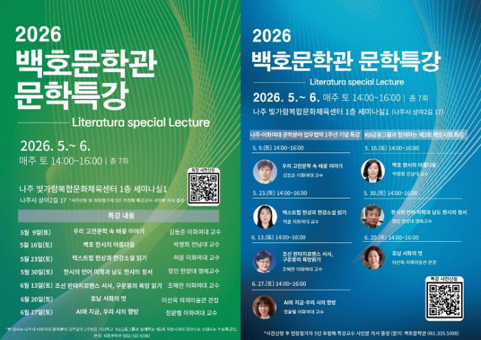 한시특강은 5월 16일 박명희 전남대학교 교수의 ‘백호 한시의 아름다움’을 시작으로 5월 30일 정민 교수의 ‘한시의 언어 미학’, 6월 20일 이선옥 의재미술관 관장의 ‘호남 서화의 멋’ 강연이 진행된다.