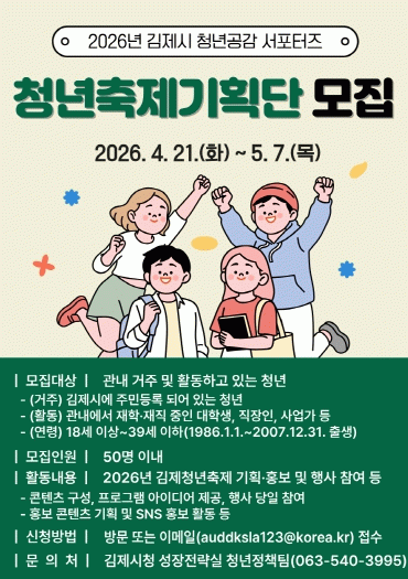 모집 기간은 오는 5월 7일까지이며, 김제시에 거주하거나 관내에서 활동 중인 18세 이상 39세 이하 청년이면 누구나 신청할 수 있다. 모집 인원은 50명 이내로, 신청은 시 성장전략실 방문 또는 이메일을 통해 가능하다.