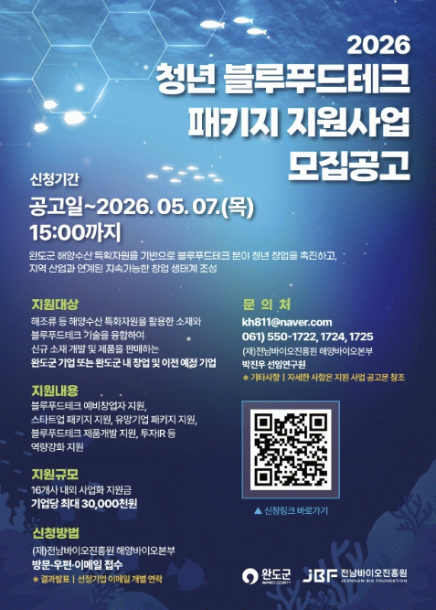 사업은 5월 7일까지 완도읍 농공단지에 위치한 해양바이오본부로 방문·우편 신청을 하고, 기타 자세한 사항은 (재)전남바이오진흥원 및 완도군 누리집을 통해 확인할 수 있다.