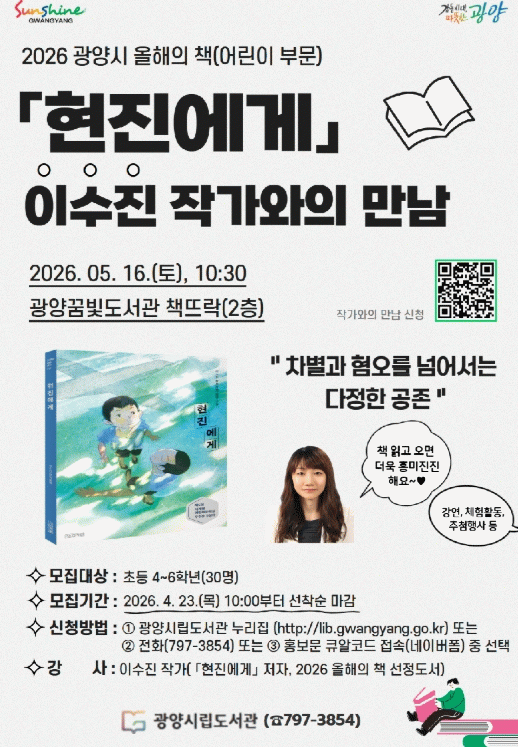 광양시 관계자는 “이번 강연이 어린이들이 작품을 이해하는 데 도움이 되길 바란다”며 “책을 읽는 즐거움과 생각을 나누는 기쁨을 느끼는 시간이 될 것”이라고 말했다.