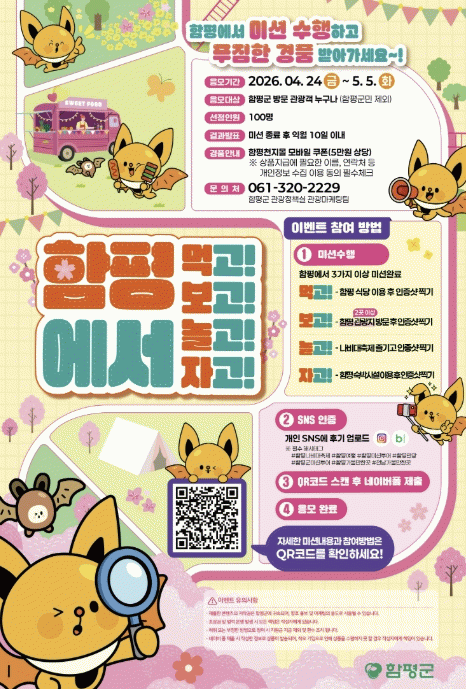 함평군은 “오는 24일부터 내달 5일까지 관광객을 대상으로 미션형 이벤트 ‘함평 먹보놀자(먹고·보고·놀고·자고) 미션투어’를 운영한다”고 22일 밝혔다.