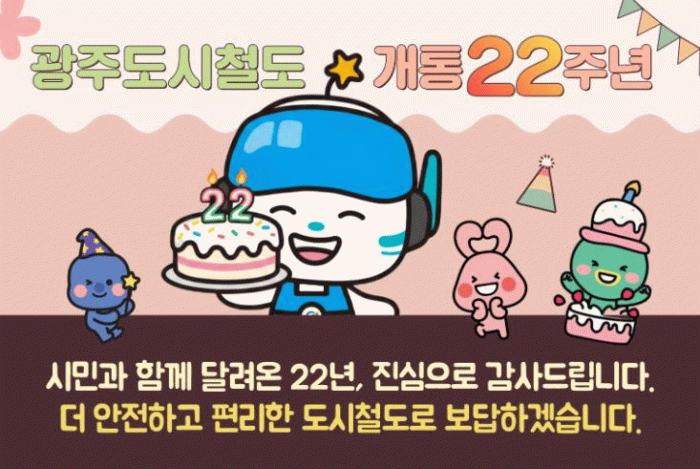 문석환 광주교통공사 사장은 “22년 동안 시민과 함께 성장해 온 도시철도가 앞으로도 안전과 편의를 최우선으로 더 나은 교통서비스를 제공하겠다”며 “이번 행사에 많은 시민들의 관심과 참여를 바란다”고 말했다.