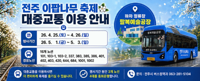 시는 올해 4월 벚꽃 개화 시기에 맞춰 만경강변 일대에 특별노선을 운영하는 등 계절별 관광수요에 대응한 교통 지원을 추진했으며, 이러한 운영 경험을 바탕으로 이번 이팝나무 축제 기간에도 교통 운영을 이어갈 계획이다.