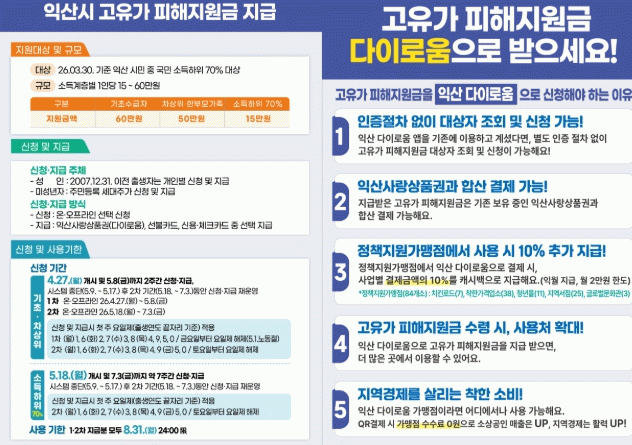 정헌율 익산시장은 "고유가 피해지원금은 중동전쟁발 고유가, 고환율, 고물가로 인한 시민 부담을 덜고 취약계층을 보다 두텁게 지원하기 위한 정책"이라며 "시민 여러분께서는 익산 다이로움으로 피해지원금을 수령해 더 많은 혜택을 누리시길 바란다"고 말했다.