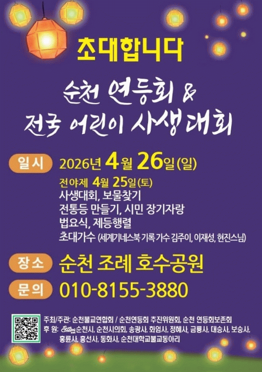 오후 6시부터는 취타대 행진과 법고시연 등 식전 공연이 분위기를 고조시키며 본격적인 행사는 오후 7시부터 봉축 법요식을 시작으로, 시상식과 제등행렬, 전통문화공연으로 이어져 순천의 밤을 자비의 빛으로 수놓을 예정이다.