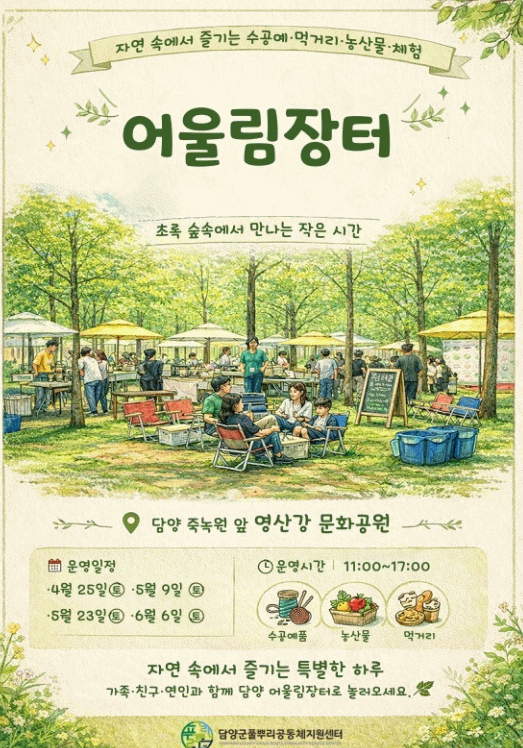 ‘어울림장터’는 담양 관내 풀뿌리공동체와 농촌인재양성과정을 통해 육성된 마을공동체, 마을기업, 사회적경제조직, 소규모 생산자 등이 참여하는 판매·체험형 장터로, 지역 생산품의 홍보와 판로 확대를 목적으로 추진된다.
