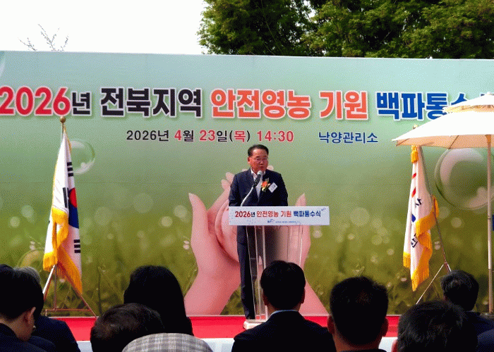 도는 23일 정읍시 태인면 낙양관리소에서 ‘2026년 안전영농기원 통수식(백파제)’을 개최했다. 이날 행사에는 김종훈 경제부지사를 비롯해 한국농어촌공사 관계자, 전북 농업인단체연합회장 등 100여 명이 참석해 풍년 농사와 안전한 영농을 기원했다.