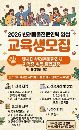 펫시터·반려동물관리사 자격증 취득 통합과정은 광주시에 거주하는 19∼39세 청년 5명을 오는 5월6일까지 모집한다.