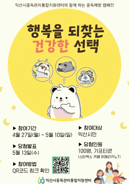 시는 익산시중독관리통합지원센터와 함께 오는 27일부터 5월 10일까지 온라인 캠페인 '행복을 되찾는 건강한 선택'을 진행한다.