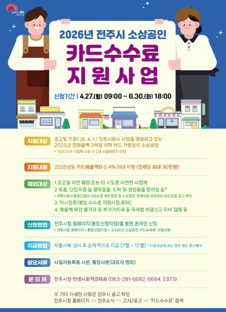 시는 오는 27일 09시부터 6월 30일 18시까지 전주시 소상공인을 대상으로 2025년도 카드매출액의 0.4% 이내, 업체당 최대 30만 원까지 지원하는 ‘2026년 소상공인 카드수수료 지원사업’ 신청을 접수한다.