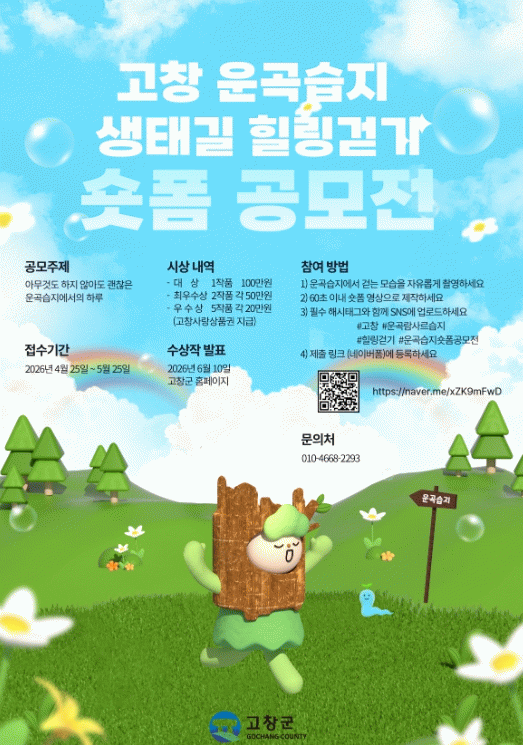 참여 방법은 고창 운곡습지에서 걷는 모습을 자유롭게 촬영해 60초 이내의 숏폼 영상으로 제작한 뒤, 필수 해시태그(#고창 #봄날의운곡습지 #아무것도하지않아도괜찮아 등)와 함께 개인 SNS에 업로드하고 네이버 폼을 통해 해당 링크를 제출하면 된다.