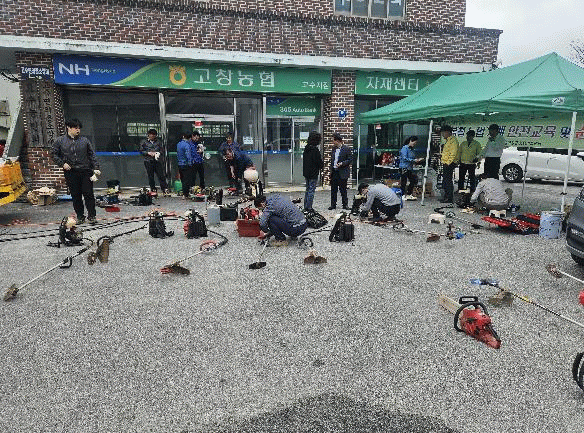 지난 27일 고수면 농협 광장에서 진행된 순회수리 현장에서는 봄철 필수 장비인 예초기 2종 50여 대를 집중적으로 정비했다.