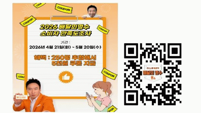 배달의명수 설문조사에 참여한 인원 중 총 500명(소비자 250명, 가맹점주 250명)을 대상으로 소비자는 추첨을 통해, 가맹점주는 선착순으로 ‘배달의명수 5,000원 할인 쿠폰’을 지급할 예정이다.
