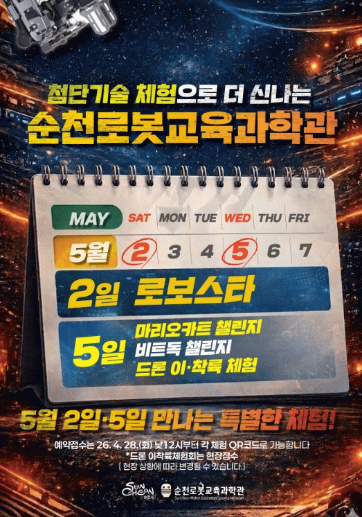 해당 프로그램들은 28일 낮 12시부터 예약접수를 시작하며, 상세 내용은 순천로봇교육과학관 홈페이지를 참고하거나 전화로 문의하면 된다.