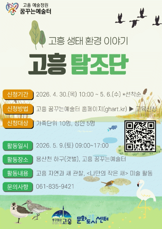 신청은 오는 4월 30일부터 고흥 꿈꾸는예술터 누리집을 통해 할 수 있으며, 선착순으로 15명을 모집한다.
