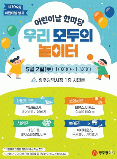 나하나 아동청소년과장은 “어린이들이 마음껏 뛰놀고 즐기며 특별한 추억을 만들 수 있도록 다양한 프로그램을 준비했다”며 “가족 모두가 함께 참여해 행복한 시간을 보내시길 바란다”고 말했다.