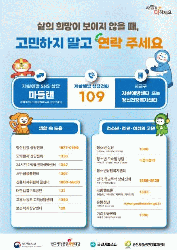 한편, 우울감 등 말하기 어려운 고민이 있을 경우 자살예방 상담전화 또는 군산시 정신건강복지센터를 통해 24시간 상담을 받을 수 있다.