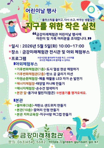 김현숙 기후환경과장은 “어린이날을 맞아 아이들이 놀이와 체험을 통해 환경 문제를 쉽게 이해하고, 가정에서도 실천할 수 있는 작은 행동을 배워가는 시간이 되길 바란다”며 “앞으로도 체험관 전시와 연계한 다양한 환경교육 프로그램을 통해 지역의 환경교육 거점 역할을 강화해 나가겠다”고 말했다.
