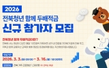 고창군 클릭뉴스2026. 03.05[클릭뉴스]고창군이 근로 청년의 자산형성을 지원하고 안정적인 지역정착 기반을 마련하기 위해 ‘2026년 전북청년 함께 두배적금’ 참여자를 모집한다고 밝혔다. ‘전북청년 함께 두배적금’은 청년이 매월 10만원을 2년간 적립하면 전라북도와 고창군이 동일 금액을 매칭 지원하는 사업으로, 만기 시 최대 500만원의 목돈을 마련할 수 있는 청년 자산형성 지원사업이다. 모집기간은 오는 16일까지이며, 모집인원은 30명이다. 신청대상은 공고일 기준 고창군에 거주하는 18세부터 39세 이하의 근로 청년으로, 가구 기준 중위소득 140% 이…