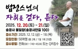 순천시 클릭뉴스2025. 12.15[클릭뉴스]순천시는 법정스님의 삶과 정신을 시민들과 함께 나누기 위한 인문 체험 프로그램 '법정스님의 자취를 걷다, 듣다'를 오는 20일부터 21일까지 송광사 불일암 일원에서 운영한다고 밝혔다. 이번 프로그램은 법정스님의 수행 터전이었던 불일암에서 진행되는 시민 참여형 인문 프로그램으로, 총 2회(회당 25명) 운영하며 총 50여 명이 참여할 수 있다. 접수는 오는 18일까지 전화(061-749-4534) 또는 QR코드로 신청 가능하다. 특히 이번 프로그램은 최근 예비문화유산으로 선정된 ‘법정스님 빠삐용 의자’와 함께 소개되…