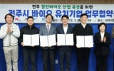 군산시 클릭뉴스2025. 12.02[클릭뉴스]첨단바이오 분야 기술력을 보유한 국내 기업들이 전주에 둥지를 틀면서 바이오산업을 새로운 성장동력으로 육성해 온 전주시의 계획에 힘이 실리게 됐다. 전주시는 2일 전주시청 3층 소회의실에서 파마로보틱스와 뉴아인, 하이퍼틱스 등 첨단바이오 분야 기술력을 보유한 3개 기업과 공동 성장을 위한 업무협약을 체결했다. 이날 협약식에는 우범기 전주시장과 세 기업의 대표 등 관계자 8명이 참석했으며, 이들은 기업 애로 해소와 산업 생태계 확장을 위한 상생 협력에 나서기로 뜻을 모았다. 이 자리에서 시는 현재 추진 중인 연구개…