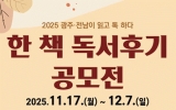 전라남도 클릭뉴스2025. 11.18[클릭뉴스]전남대학교 도서관은 11월 17일부터 12월7일까지 ‘2025 한 책 독서후기 공모전’을 진행한다. 이번 공모전은 ‘광주·전남이 읽고 톡 하다’사업의 일환으로, 올해의 한 책으로 선정된 김애란 작가의 『이중 하나는 거짓말』을 읽고 독서의 의미를 나누고 서로 다른 생각을 공유하기 위한 취지로 마련됐다. 공모전에는 전남대학교 재학생뿐만 아니라 광주·전남 지역민 누구나 참여할 수 있다. 자세한 사항은 전남대학교 도서관 홈페이지 공지사항을 참고하면 된다. 전문가 심사를 통해 최우수·우수·장려 등 각 부문별 수상자를 선…