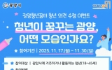 광양시 클릭뉴스2025. 11.17[클릭뉴스]광양청년꿈터가 11월 17일부터 11월 30일까지 ‘청년이 꿈꾸는 광양, 어떤 모습인가요?’를 주제로 청년 의견 수렴 이벤트를 진행한다. 이번 이벤트는 광양시 청년들의 다양한 목소리를 듣고, 청년이 바라는 광양의 미래상을 향후 청년정책과 프로그램 운영에 반영하기 위해 마련됐다. 참여 대상은 광양시에 거주하거나 광양시에서 활동하고 있는 18세~45세 이하 청년이다. 참여 방법은 광양청년꿈터 공식 SNS(네이버 블로그·인스타그램) 중 한 곳을 팔로우한 뒤, ‘청년이 바라는 광양의 모습’을 자유롭게 작성해 팔로우 인증…