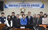 해남군 클릭뉴스2025. 11.13[클릭뉴스]광주 북구의회 정달성 의원(용봉·매곡·삼각·일곡동/더불어민주당)이 13일 이숙희 의원과 함께 ‘장애인친화도시 조성을 위한 정책간담회’를 개최했다. 이번 간담회는 북구 장애인친화도시 조성의 현주소를 점검하고, 현장의 다양한 의견을 바탕으로 민·관·정 차원의 공감대 형성과 실질적인 정책 방향을 모색하기 위해 마련됐다. 이날 간담회에는 정달성·이숙희 의원을 비롯해 오방장애인자립생활센터장, 예그리나장애인센터장, 장애인문화관광센터 사무국장, (사)한국신장장애협회 광주협회 사무처장, 전남대 동아리 ‘내일프로젝트’ 대외협력부장, …