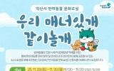 익산시 클릭뉴스2025. 11.13[클릭뉴스]익산시가 올바른 반려동물 문화 확산을 위한 교육의 장을 연다. 익산시는 오는 29~30일 함열 다송무지개 매화마을에서 '반려동물 문화교실'을 열고, 반려동물 이론 교육과 실습을 진행한다고 13일 밝혔다. 이번 교육은 사람과 동물이 함께 어울리는 사회 분위기를 조성하고, 성숙한 반려동물 인식과 예절 확산을 위해 마련됐다. 참가비는 무료이며, 교육 대상은 동물보호법에 따라 동물등록을 완료한 익산시민이다. 참여를 원하는 경우 익산시 누리집을 통해 온라인으로 신청하면 된다. 신청 기간은 오는 17~21일이며 선착순 8…