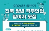 전라북도 클릭뉴스2025. 11.12[클릭뉴스]전북특별자치도와 전북창조경제혁신센터가 ‘2026년 상반기 전북 청년 직무인턴’ 참여자를 11월 26일까지 모집한다. ‘전북 청년 직무인턴’은 도내 공공기관과 기업에서의 실무형 직무 체험을 통해 청년들의 취업 준비와 진로 탐색을 지원하는 전북 대표 청년 일자리 프로그램이다. 2017년부터 운영해오며 현장 경험 중심의 역량 강화 모델로 자리 잡았다. 올해에는 상하반기 총 433명이 참여했으며, 내년 상반기에는 전북은행, 전북국제협력진흥원, 전북신용보증재단 등 42개 기관·기업에서 215명의 청년이 참여할 예정이다. …