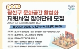 광산구 클릭뉴스2026. 04.13[클릭뉴스]광주 광산구가 지역 유휴 문화공간을 열린 시민 문화 거점으로 활용하는 ‘2026년 문화공간 공유 활성화 지원사업’을 추진한다. 사용이 활발하지 않은 공공‧민간 문화공간을 시민의 문화 체험 및 예술 프로그램 운영 장소로 개방해, 시민 간의 문화적 연대를 강화하고 일상 속 문화 향유 기회를 확대한다는 취지다. 문화공간은 창작 예술 활동, 시민을 위한 여러 프로그램 운영이 가능한 시설로, 공연장, 전시시설, 도서관, 다중 이용 창작공간 등이 대표적 예다. 광산구는 23일까지 사업에 동참할 단체를 모집한다. 광산구에 문화…