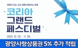 광양시 클릭뉴스2025. 10.29[클릭뉴스]광양시는 전국 단위 소비진작 행사인 ‘코리아 그랜드 페스티벌(Korea Grand Festival)’ 기간(2025. 10. 29.~11. 9.) 동안 광양사랑상품권 할인율을 한시적으로 18%로 상향한다고 밝혔다. ‘코리아 그랜드 페스티벌’은 국무조정실, 기획재정부, 행정안전부, 산업통상자원부와 행정안전부, 문화체육관광부 등 관계 부처가 공동으로 추진하는 국가대표 소비축제다. 행사 기간에는 △지역사랑상품권 및 디지털온누리상품권 특별할인 △상생소비복권 (20억 원 규모) 신규 시행 △농·축·수산물·생필품 특별할인 △숙…