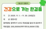 광양시 클릭뉴스2025. 10.21[클릭뉴스]광양시는 지역 주민의 건강생활 실천을 돕기 위해 11월 1일부터 30일까지 모바일 걷기 앱 '워크온'에서 ‘건강으로 가는 한걸음 11월 걷기 챌린지’를 운영한다고 밝혔다. 이번 걷기 챌린지는 1걸음당 1마일리지가 적립되며, 1일 최대 8천 마일리지가 누적된다. 기간 중 20만 보를 달성하면 20만 마일리지가 쌓여 모바일상품권(5천 원권) 응모가 가능하다. 시는 목표 걸음을 달성한 참여자 중 추첨을 통해 800명에게 상품권을 지급할 예정이다. 참여를 희망하는 시민은 모바일 걷기 앱 ‘워크온’을 설치하고 ‘광양시 …