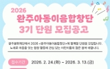 익산시 클릭뉴스2026. 02.25[클릭뉴스] (재)완주문화재단은 오는 2월 24일부터'완주아동이음합창단'3기 단원 30명을 공개 모집한다고 밝혔다. '완주아동이음합창단'은 장애·비장애·다문화·학년이 함께 어우러지는 통합형 문화예술교육 프로그램으로, 정기연습과 지역 축제, 합창 경연대회 등 다양한 공연 활동을 통해 아동들이 서로를 이해하고 협력하며 공동체 의식을 키울 수 있는 기회를 제공한다. 모집 대상은 완주군 거주 아동(초등학교 1~6학년)으로, 접수 기간은 2월 24일부터 3월 13일까지이다. 정기 연습은 오는 3월부터 11월까지 매주 월요일 복…