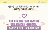 전라북도 클릭뉴스2025. 10.17[클릭뉴스]전북특별자치도가 도민이 체감할 수 있는 첫 지정기부사업을 발굴하고 20일부터 본격적인 모금에 나선다. 지정기부사업은 기부자가 고향사랑기부금을 자신이 원하는 사업을 직접 지정해 기부할 수 있는 제도로, 주민이 필요로 하는 사업에 직접 기여하고 그 성과를 눈으로 확인할 수 있다는 점에서 참여형 기부문화 확산의 새로운 계기가 될 전망이다. 이번에 추진되는 첫 지정기부사업은 ▲‘가정위탁 아동용품 구입비 지원사업’ ▲‘장애인 교통약자 이동편의 증진지원사업’ 이다. ‘가정위탁 아동용품 구입비 지원사업’은 부모의 보호를 받지 못…