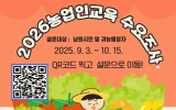 남원시 클릭뉴스2025. 09.12[클릭뉴스]남원시농업기술센터는 농업인의 교육 수요를 반영한 2026년 농업인교육프로그램을 개발·운영하기 위해 『2026년 농업인 교육을 위한 설문조사』를 실시한다. 이번 설문조사는 지역 농업인 및 귀농 귀촌인의 관심분야, 영농 애로사항, 희망 교육 주제 및 품목 등을 파악하여 현장 중심의 맞춤형 교육과정을 편성하는 데 활용될 예정이다. 설문조사는 9월 3일부터 10월 15일까지 43일간 진행되며 ▲남원시 대표 누리집 공지사항 ▲온라인 네이버폼 ▲서면작성 ▲남원시농업기술센터 누리집 ▲농업인 단체를 통한 배부 등으로 다양하게 운…