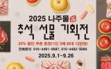 전라남도 클릭뉴스2025. 09.03[클릭뉴스]전라남도 나주시가 지역 농특산물 온라인 쇼핑몰 ‘나주몰’을 통해 추석을 맞아 전 품목 20% 할인 특판전을 열고 전국 소비자에게 믿을 수 있는 나주 농특산물을 합리적인 가격에 제공한다. 나주시는 오는 9월 26일까지 ‘2025 나주몰 추석 명절 특판전’을 열고 나주배, 배즙, 쌀, 홍어, 한우 등 대표 농특산물을 포함한 전 품목을 20% 할인한다고 3일 밝혔다. 행사 기간 중 1인당 최대 12만 원(할인쿠폰 3매)까지 혜택받을 수 있다. 특히 ‘천년이음 나주배’는 추석 명절 선물용으로 손꼽히고 있다. 품위, 당도,…