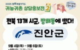 진안군 클릭뉴스2025. 09.03[클릭뉴스]진안군귀농귀촌종합지원센터는 오는 4일~6일까지 서울 서초구 양지빌딩(방배로 73)에서 열리는 '2025 전북특별자치도 귀농귀촌 상담홍보전'에 참가해 도시민을 대상으로 맞춤형 상담과 홍보 활동을 진행한다. 올해 상담홍보전은 전북특별자치도 주최, 전북특별자치도농촌사회경제서비스활성화지원센터 주관으로 13개 시군과 전북특별자치도귀농귀촌연합회, 산림조합중앙회 등이 함께 참여한 가운데 “내가 그린대로 고향의 품으로!(시즌2)”라는 슬로건 아래 열린다. 진안군은 이번 행사에서 귀농·귀산촌 정책, 스마트팜 지원 정책, 임시 거주시…