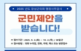 문화 클릭뉴스2025. 08.29[클릭뉴스]장성군의회는 오는 9월 2일부터 10월 2일까지 30일간 ‘2025년도 행정사무감사 군민제안 창구’를 운영한다고 밝혔다. 제안 대상은 ▲군 주요 시책과 사업의 개선·건의사항 ▲위법·부당한 행정 사례 등이다. 단, 개인 사생활 침해, 단순 숙원사업, 재판·수사 중인 사건, 명예훼손 우려가 있는 사항, 익명 제안 등은 제외된다. 이번에 접수된 내용은 장성군의회 행정사무감사 대상에 반영하거나 참고자료로 활용될 예정이며, 군민제안은 방문접수 또는 전화, 팩스 및 우편이나 장성군의회 누리집을 통해 가능하다. 심민섭 의장은…