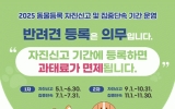 장흥군 클릭뉴스2025. 08.29[클릭뉴스]전북특별자치도가 반려견 등록을 하지 않았거나 변경신고를 미처 하지 못한 보호자들을 위해 오는 9월 1일부터 10월 31일까지 ‘2025년 2차 동물등록 자진신고기간’을 운영한다. 이 기간에 신규 등록이나 변경신고를 하면 과태료가 면제된다. 현행 제도에 따르면 주택이나 준주택에서 기르는 개, 반려 목적으로 기르는 2개월령 이상 개, 동물생산업자가 기르는 12개월령 이상의 개는 모두 등록 의무 대상이다. 동물보호법상 미등록 시 과태료는 최대 100만 원 이하, 변경사항 미신고는 최대 50만 원 이하까지 부과할 수 있다. …