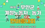 무안군 클릭뉴스2025. 08.20[클릭뉴스]전남 무안군 따르면, 오는 29일 스포츠파크 실내체육관에서 ‘제2회 무안군 계절노동자·농가 한마음대회’가 개최된다. 이번 행사는 필리핀, 라오스, 베트남 등지에서 온 외국인 계절노동자와 지역 농가, 결혼이민자가 소통하고 화합하는 자리로, 외국인계절노동자 무안군연합회(회장 강행원)가 주최하고 무안군 가족센터와 무안군 마을관리 사회적협동조합이 협업해 준비했다. 세부 프로그램은 관내 상가 음식을 활용한 먹거리와 ▲오징어게임의 명랑운동회, ▲외국인 계절노동자와 지역 농가 소통의 시간, ▲K팝 EDM 파티 등으로 참여자 간 유…