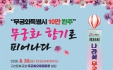 완주군 클릭뉴스2025. 08.20[클릭뉴스]완주군이 광복 80주년을 기념해 ‘광복 80년, 무궁화특별시 10만 완주, 무궁화 향기로 피어나다’를 슬로건으로 한 제35회 나라꽃 무궁화 완주축제를 오는 30일 고산문화공원(무궁화테마식물원 일원)에서 개최한다. 올해 축제는 ‘무궁화꽃이 피었습니다’, ‘무궁화 황금반지를 찾아라’ 등 대표 이벤트와 식전공연을 비롯해 다양한 체험과 공연 프로그램으로 꾸며진다. 아름다운 무궁화를 가정에서도 감상할 수 있도록 무궁화 화분 나눠주기, 무궁화를 느낄 수 있는 무궁화 그림대회, 무궁화 서예대회, 무궁화 체험프로그램, 전통놀이, 축…