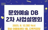 화순군 클릭뉴스2025. 08.06[클릭뉴스](재)화순군문화관광재단은 8월 12일 오후 2시 화순 어울림센터 다목적강당에서 ‘2025 문화예술인 DB 구축 2차 사업설명회’를 개최한다고 밝혔다. 이번 설명회는 화순에서 활동 중인 문화예술인 및 단체를 대상으로 하며, 사전 신청자 누구나 참여할 수 있다. (재)화순군문화관광재단은 지역에서 활동하는 예술인과 예술단체 현황을 한눈에 볼 수 있는 화순군 문화예술 데이터베이스(DB) 구축 사업을 추진 중이다. 이는 화순 문화예술의 향후 정책 및 지원사업에 있어 기초자료로 활용하기 위한 것으로서 지난 5월 26일 문…