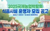 전라남도 클릭뉴스2025. 08.04[클릭뉴스](재)전라남도국제농업박람회는 2025 국제농업박람회 식음시설 운영자를 오는 13일까지 3주간 모집한다고 밝혔다. 이번 모집은 주제전시관인 농업미래관 옆 뷔페관(288석·600㎡)과 행사장 내 푸드트럭을 대상으로 진행한다. 전남·광주지역 주소를 두고 해당 업종을 정상적으로 운영 중인 업체면 신청할 수 있다. 자세한 내용은 국제농업박람회 누리집의 공고문에서 확인할 수 있으며, 궁금한 사항은 국제농업박람회 행사운영팀으로 문의하면 된다. 박관수 전남도국제농업박람회 사무국장은 “성공적 행사를 위해서는 먹거리가 매우 중요하…