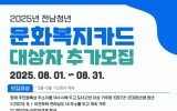 여수시 클릭뉴스2025. 08.04[클릭뉴스]여수시는 ‘2025년 전남청년 문화복지카드 지원사업’ 대상자를 8월 한 달간 추가 모집한다. ‘전남청년 문화복지카드 지원사업’은 지역 청년에게 연간 25만 원의 문화복지비를 지원해 문화 향유 기회를 확대하기 위한 사업으로, 2022년부터 시행되고 있다. 여수시는 올해 상반기 16,649명의 청년을 대상자로 선정했으며, 이번 추가 모집을 통해 상반기에 신청하지 못한 청년 2,203명을 추가로 선정할 계획이다. 신청 대상은 2023년 8월 1일 이전부터 전남 도내에 2년 이상 주소를 두고 있는 1997년부터 2006년…