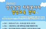 고창군 클릭뉴스2025. 08.04[클릭뉴스]고창군정신건강복지센터가 오는 8월27~29일 고창군보건소 2층 대회의실에서 실시하는 ‘정신건강자원봉사자 양성교육’에 참여 주민을 모집한다. 모집 인원은 선착순 30명이며, 신청은 22일까지 전화 또는 홈페이지를 통해 가능하다. 교육은 총 6시간의 이론 중심 과정으로 구성됐으며, ▲아동·청소년 정신건강의 이해 ▲정신질환별 특성(우울증, 조현병, 강박증 등) ▲보고듣고말하기 생명지킴이 양성교육 등 다양한 정신건강 주제를 다룬다. 강의는 정신건강의학과 전문의와 정신건강복지센터 실무자가 함께 진행해 이론과 실제를 아우르…